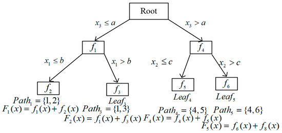 where is the collection of models along the path from the root node to the leaf node, and C is a constant. The left and right child nodes’ respective loss functions are denoted by and . Meanwhile, Equation (9) can be optimized by minimizing and , with node splitting and gradient lifting. One can refer to [20] for more details.