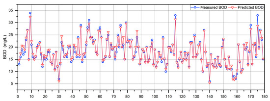 The proposed En-WBF approach was evaluated in comparison with seven baseline methods in predicting effluent BOD, including SVR [21], GBRT [8], RF [22], XG-Boost [23], RVM [24], ANN [25], and LSTM [16], in order to compare its prediction performance. The parameter descriptions and values of the above seven baseline methods are shown in Table 3. In addition, Figure 3 shows the performance validation of En-WBF on the prediction of effluent BOD. It depicts an elementwise comparison of the measured BOD values (denoted by blue circles connected with a line) and the corresponding predicted BOD values (indicated by red triangles connected with a line). The plotted data points show the fluctuations in the BOD concentration over the samples. Both the measured and predicted values appear to follow a similar trend across the dataset, illustrating the En-WBF’s predictive capability.
