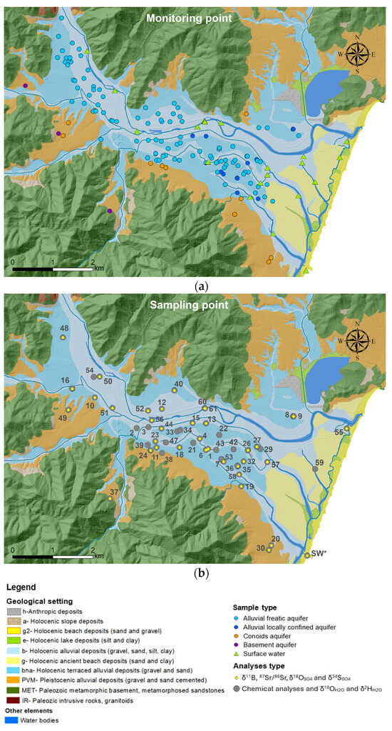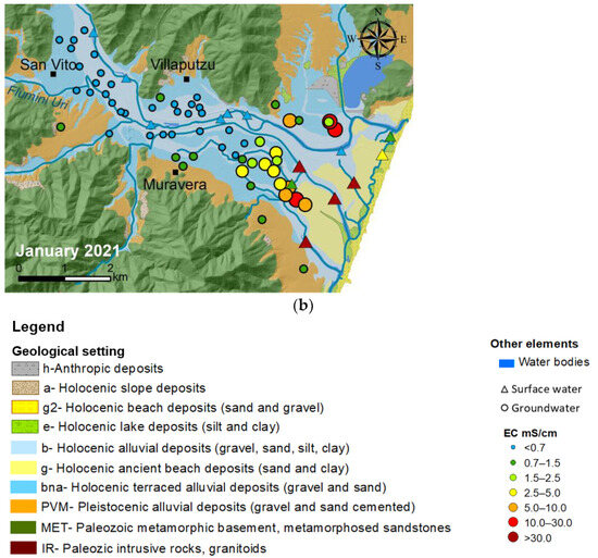 Based on the geometry of the Muravera aquifer [30], the possible sources of recharging (like rivers and lateral aquifer), and results from the hydrogeological monitoring, a total of 53 water points were selected for geochemical and isotope investigations in 2020, comprising the following: