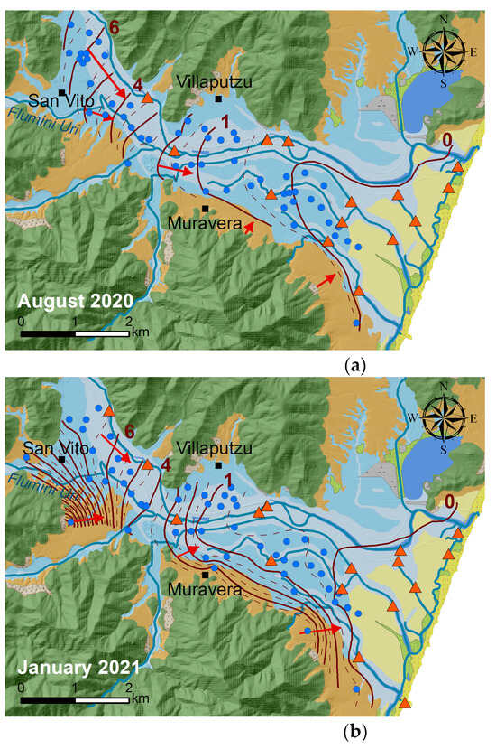 Interactions between the Flumendosa River and groundwater vary along the plain. Figure 3 shows that in the north-western part, the Flumendosa River is drained by the aquifer, while in the central part of the plain, downstream of Villaputzu village, the trend is reversed, and the aquifer is drained by the Flumendosa River. Recharge from the Flumini Uri River to the aquifer is also observed. The water table’s zero level is approximately 2 km from the inland shoreline during the winter. In the summer, the piezometric head decreases by about 1.5 m across the entire plain, and the zero level moves inland by about 1 km.