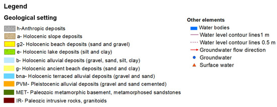 A high-productivity porous aquifer is hosted within the Holocene alluvium, which reaches a maximum thickness of 50 m; the aquifer is mostly phreatic in the western part of the plain, while moving eastward, the occurrence of silt and clay deposit intercalations, with variable extension and thickness, produce the local confinement of the aquifer [30]. Low-productivity aquifers are hosted within the Pleistocene alluvial deposits (gravel and sand cemented) and the metamorphic basement and can contribute to the lateral recharge of the alluvial aquifer.