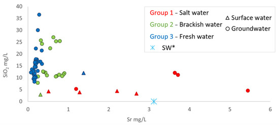 The same processes are evident in the Ca vs. Na graph (Figure 7a), where different trends are recognized. The first trend is observed in surface water, where increasing salinity (Group 1, in red in Figure 7) leads to an increase in the Na/Ca ratio compared to the seawater dilution line. Both the Foxi surface water (Group 1) and SW* sample follow this trend, indicating a simple mixing process. On the other hand, the groundwater of Group 1 follows a different trend, with a lower Na/Ca compared to seawater. This behavior may be attributed to the Ca-Na cation exchange processes, resulting from water interactions with the clayey matrix of the aquifer and facilitated by long interaction times. The SiO2 vs. Sr graph in Figure 8, in fact, shows that groundwater samples in Group 1 have higher concentrations of both strontium and silica than seawater, which can be explained by prolonged water–rock interaction times. The groundwater for Group 2 and Group 3 had relatively consistent sodium concentrations, while calcium concentrations increased more rapidly. In freshwater samples (Group 3), the equivalent Ca-HCO3 ratio was very close to one, suggesting that calcite may be the source of Ca in these waters. However, for saline and brackish waters, HCO3 concentrations appeared to be controlled, highlighting the occurrence of exchange processes (Figure 7b).