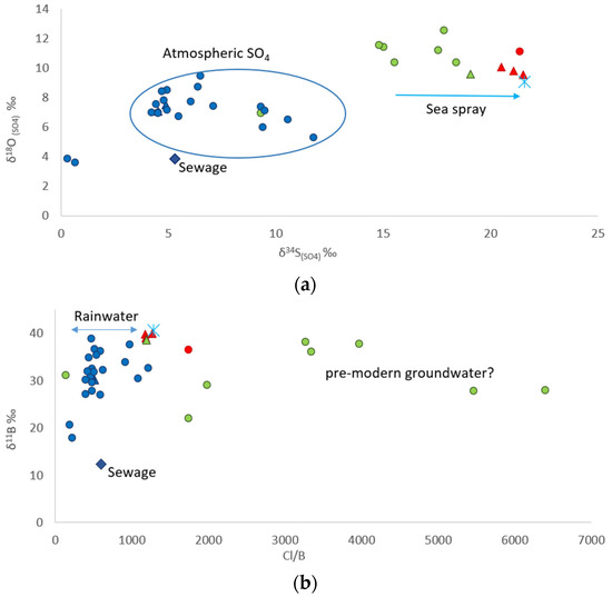 (a): δ18OSO4 vs. δ34SSO4, (b): δ11B vs. Cl/B. Legend is presented in Figure 9.