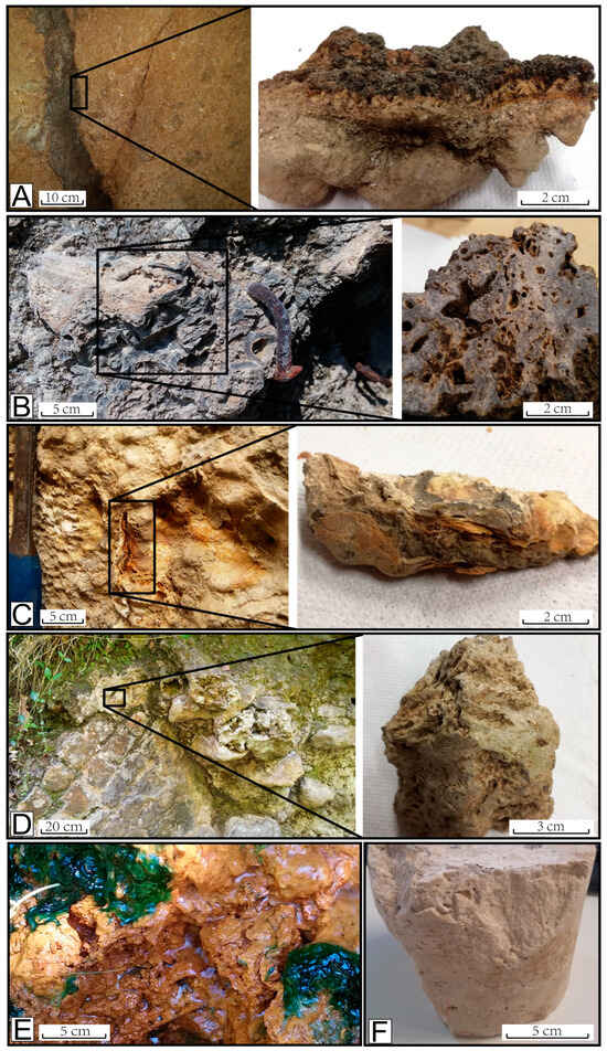 Pictures of sampled rocks in situ (left) and the related appearance of the sampled portions at the macroscopic scale (right): sample ON representing materials filling the tunnel rocks at the Campetti Southwest site (A); sample TV from a travertine tank vault in Campetti Southwest (B); sample XX from the carbonate Roman tank in Campetti Southwest (C); sample TB from a grey travertine coverture of an Imperial wall near the Bagni della Regina spa (D); sample FR representing sediments from the S3 spring in the Valchetta Stream (E); TG sample (F).