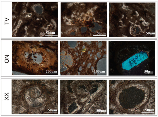 Calcite is the most abundant mineral in XX, TV, and FR (Table 2), associated with hematite (sample FR) and fluoro-apatite (sample XX). ON is the unique sample without calcite, in agreement with the textural appearance observed under the microscope. This sample has an unstructured XRDP pattern, indicating the prevalence of the amorphous phase. Peaks associated with feldspar are absent even if a crystal was detected under the microscope (Figure 4), indicating that this phase has an extremely low abundance. The blackish color of the matrix is due to the goethite mineralization.