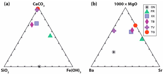 The chemical compositions of TG, TV, TB, XX, and FR (Table S2) confirm they are travertines, characterized by different amounts of oxides (Figure 5a,b).