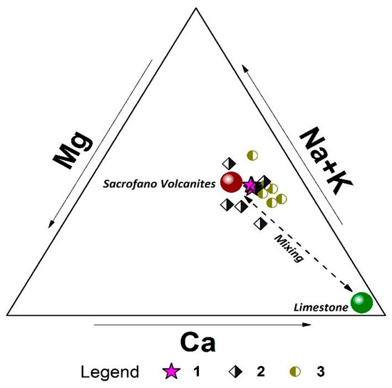 Relative compositions of major metals in local springs and for Sacrofano volcanites and limestone formations. Legend: (1) thermal mineral springs sampled in this study; (2) literature data from [20]; (3) literature data from [43]. Detailed data are reported in Table S1.