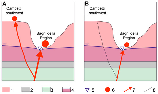 Scheme of the hydrogeological evolution of the thermal mineral springs at the Veii site (not to scale). First stage: presence of a thermal mineral spring in Campetti Southwest and higher flow in Bagni della Regina spa (A); Present stage: no active springs are present at Campetti Southwest, and the discharge rate of Bagni della Regina is significantly reduced (B). Legend: (1) Volcanic deposits; (2) Regional aquiclude; (3) Carbonate units; (4) Volcanic aquifer; (5) gaining stream; (6) Thermal mineral spring (discharge rate is proportional to the size); (7) Upflow of deep thermal mineral fluids (upflow rate is proportional to the thickness of the arrow); (8) Sealed fracture.