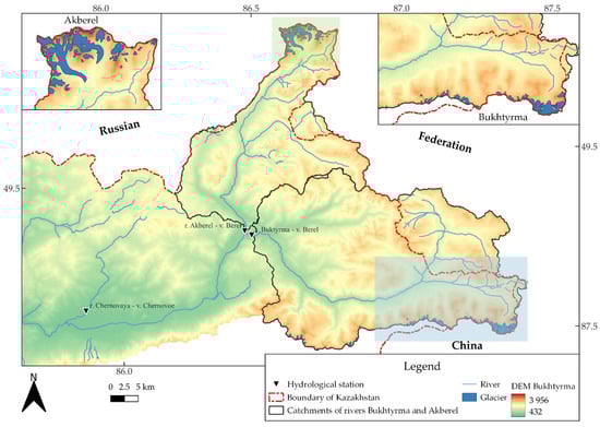 Figure 1 shows the location of river catchments, indicating locations of flow monitoring and meteorological characteristics. Before reaching the Buktyrma Reservoir, it is fed by several tributaries, including Ak Berel, Chernovaya, Sarymsakty, Belaya, Cheremoshka, Khamir, and Berezovka, as outlined in