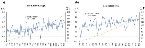An analysis of the total integral curves of average annual air temperatures at the Katon-Karagay and Seleznevka meteorological stations reveals intensive warming since the early 1980s. The coefficients of determination of air-temperature trends also indicate significant increases in average annual air temperatures. Specifically, compared to the period before 1980, average annual air temperatures increased by 1.0 °C at Katon-Karagai and 0.9 °C at Seleznevka.