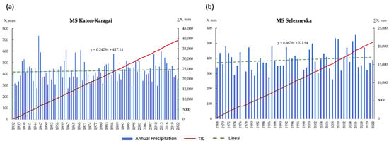 Figure 4). Since 1981, the long-term average annual precipitation at the Katon-Karagay meteorological station has risen by 14 mm, while at the Seleznevka weather station, it has increased by 4 mm compared to the preceding period up to 1980.