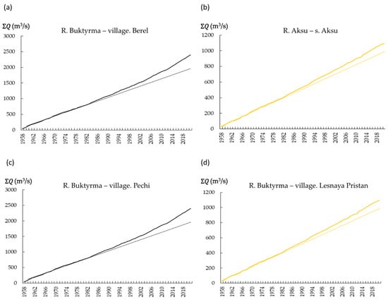 Figure 5). The calculated trends in fluctuations in the average annual runoff, as per the equations, did not demonstrate high significance. An analysis of the homogeneity of a series of average annual water flows using summary integral curves provides a clearer identification of homogeneous periods characterized by stationary indicators of runoff series, primarily norms (