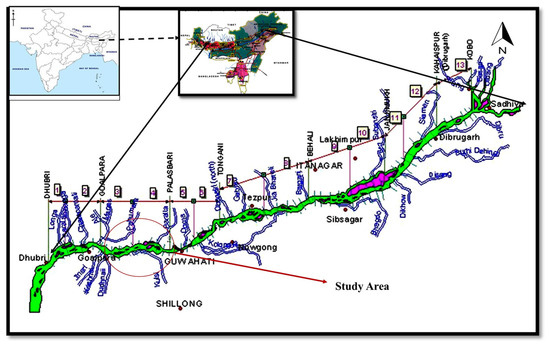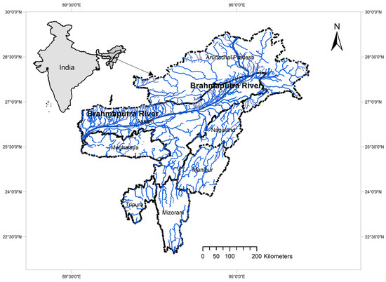 The Brahmaputra River is a trans-Himalayan River. All along its course, it registers significant changes in discharges and planform [1]. The river runs for 2880 km through China, India, and Bangladesh. In Assam’s alluvial plains, the river has a braided channel throughout its course. The variation in the bank line causes shifting confluences with its tributaries. The river gradient at Dibrugarh is around 0.09–0.17 m/km. It then drops to around 0.1 m/km at Pandu in the Assam flood plain. The Brahmaputra in the Assam valley flows from east to west for 640 km before it enters Bangladesh. Figure 1 depicts the Brahmaputra River’s position in India. In this stretch, it receives 103 tributaries: 65 on the right (north) bank and 38 on the left (south) bank. The Brahmaputra, along with the drainage network of its tributaries, controls the geomorphic regime of the region.