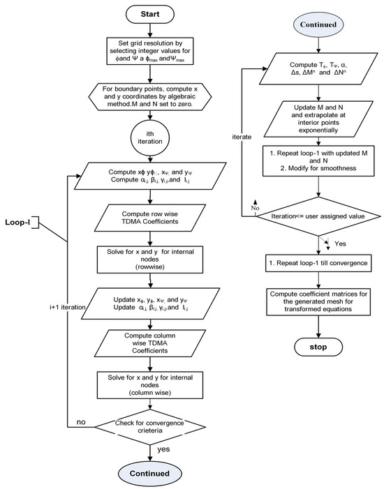 The governing differential equations for engineering problems are derived and expressed in a Cartesian (rectangular) coordinate system. We must discretize the continuous physical space into a uniform orthogonal computational space to solve these differential equations [25]. A detailed flow chart is presented in Figure 3.