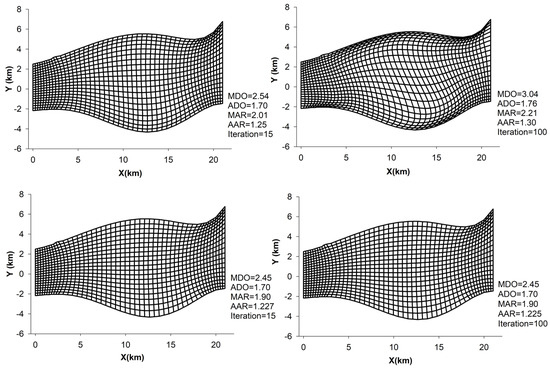 where Iw, Is, and Io are measures for adaptivity, uniformity, and orthogonality, respectively. The Jacobian I represent the area of a mesh cell in two dimensions and is the weighing factor. When this integral is minimized, (with ) should have a uniform distribution, so when the weighting function is large, the mesh size should be small. The weighting function is often formulated using water depth or bed bathymetry to handle complex hydrodynamic problems. If the numerical solutions such as the concentration or the velocity gradients are selected, the mesh shall be adaptive dynamically with the numerical solution [29]. The factor is added to enforce the orthogonality with higher weighting for large cells in Equation (11c). If the three indices approach their minimum values, the mesh would have the optimal combination of uniformity, orthogonality, and adaptivity. In general, a mesh can be generated by minimizing the sum of the three integrals with a relative weighing factor with each integral. Since it is impossible to achieve optimized weighing factors at the same time, for a particular mesh, one needs to select the appropriate combination of these coefficients. In this study, orthogonality was emphasized more than other indices for the numerical ease of hydrodynamic solution. It should be mentioned here that topographical variations were irregular and large, and the mesh used in this study was of fixed domain. Hence, optimizing indices like adaptivity and uniformity may increase complications in obtaining feasible mesh generation with nearly orthogonal grids.