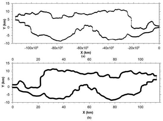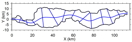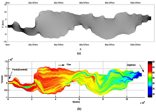 As stated, domain boundaries (main channel and largely low flood plain) for the study period were extracted in a geographical coordinate system from the remote sensing imagery shown in Figure 6 and transformed into a Cartesian coordinate system to accurately represent the domain in the Cartesian plane (Figure 7). The main waterway, low flood plains, and high flood plains were all cross-sectioned. Some segments within the river study stretch have dikes built for flood protection purposes. Poor maintenance often leads to breaches in these dikes during high-flood seasons. Low- and medium-flood periods result in inundation of the main channel and low flood plains. Keeping this in view, care was taken to extract the flow domain to include the primary flood plain, and then cross-sections were fitted.