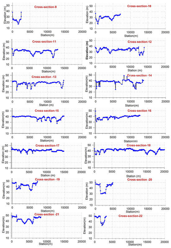The reduced levels of the river cross-sections of the post-monsoon period for the year of 1997 were collected for all fourteen pre-defined river cross-sections from the Brahmaputra Board, Government of India. The positioning of the measured cross-sections and mid-central line (in blue) into the domain is represented in Figure 8 and are depicted in graphical form in Figure 9. The data were normalized. The bearing at cross-section 22 (C/s-22) was zero and was the physically identified position on the imagery used to extract the domain. Taking reference to C/S-22, cross-sections could be positioned and oriented if chainage and bearing were known. To characterize the flow-carrying capacity of a stream and its associated floodplain, measured cross-sections were placed at intervals along the stream as per their orientations. They extended across the entire floodplain and were perpendicular to the anticipated flow lines. Every effort was made to obtain interpolated stream bed data at mesh nodes based on these measured cross-sections so that the data would accurately represent the stream and floodplain geometry. The adopted process of bed interpolation appropriate for the available data set is discussed in subsequent sections.