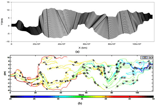 From the normalized data point of each cross-section, 21 data points were linearly interpolated for each set of two adjacent cross-sections through HEC-RAS (Hydrological Engineering Center-River Analysis System) geometric interpolation application software [34] to interpolate the data along the deepest bed level, ensuring flow continuity in the main channel. Thus, a structured matrix of dimension 101 × 261 data points was generated. It is presented graphically in Figure 10a, and the corresponding contour plot of bed-elevation is presented in Figure 10b.