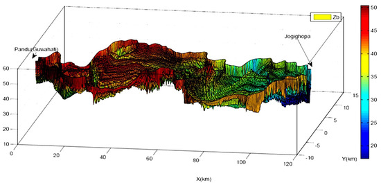 Along the Brahmaputra River, there are three to four restricted nodal sites where the cross-sections remain constant in time and space. Therefore, due to its division by well-defined nodal points (with invariant width), the Brahmaputra reach presents a relatively simple 2D mathematical model application for both upstream and downstream border implementations. The existence of various 3D flow structures inside the flow domain makes the process of modeling a fully evolved braided stream a difficult undertaking. This analysis was conducted using data sets for a river stretch with two restricted nodal points, namely Pandu and Jogighopa, of roughly 100 km in reach length of the Brahmaputra River, with fourteen measured river cross-sections and 1997 hydrological data points.