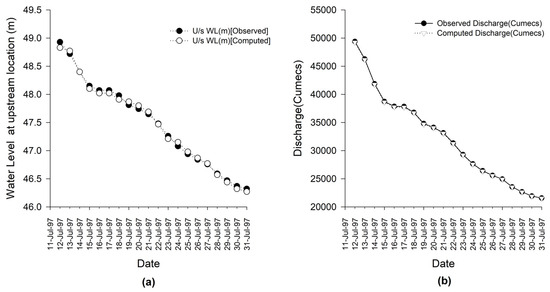 (a) Observed versus computed WSL plot for u/s location (b) discharge for d/s location for the study reach of Brahmaputra River during receding flood of the year of 1997. (Reprinted (adapted) with permission from reference [33]. Copyright 2024, Springer, Singapore.)