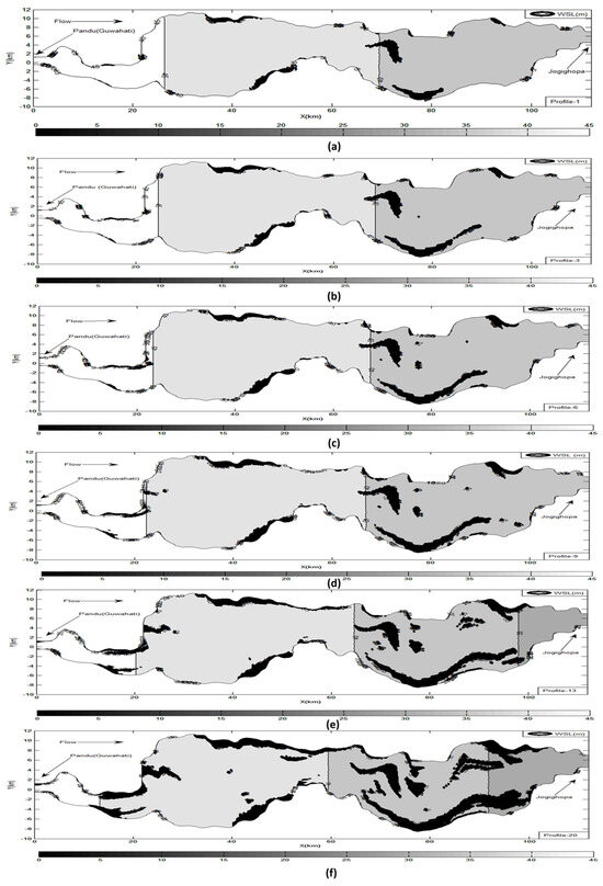The wetting and drying technique was incorporated to judge whether an individual grid was wet or dry by assigning a threshold depth of 0.02 m. In the pressure solver, all wet and dry grids participated in the solution. While computing water surface elevation, the H value of those nodes where the computed WSL was less than or equal to the bed elevation (i.e., H ≤ zb) was assigned a numerical threshold value of 0.02 m for solving momentum equations. In the final results, for practical purposes, H values of 0.02 or less were considered dry nodes with a water depth assigned to zero. Figure 13 shows the correlation of WSL for upstream location and discharge for downstream location when compared with the observed values suggesting the accuracy and validation. Figure 14 depicts the dry zones with zero water depth in black hues. Looking at Figure 14, it was observed that braiding intensity increased with decreasing discharges, and more and more braid bars and side bars evolved, thereby increasing the proportionate flow zone in the flow domain. Even though the flow-fields at channel bifurcations are essentially three-dimensional, the developed model with a computer-generated flow domain was able to approximate braid bars or side bars with reasonable accuracy through implementing wetting and drying techniques without developing a numerically more expensive 3D model for such a macro-scale flow field scenario.