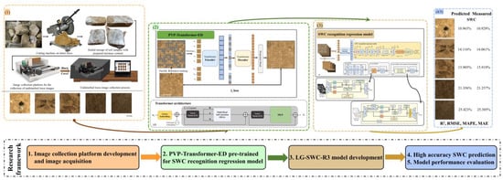 Soil water content (SWC) plays a vital role in agricultural management, geotechnical engineering, hydrological modeling, and climate research. Image-based SWC recognition methods show great potential compared to traditional methods. However, their accuracy and efficiency limitations hinder wide application due to their status as a nascent approach. To address this, we design the LG-SWC-R3 model based on an attention mechanism to leverage its powerful learning capabilities. To enhance efficiency, we propose a simple yet effective encoder–decoder architecture (PVP-Transformer-ED) designed on the principle of eliminating redundant spatial information from images. This architecture involves masking a high proportion of soil images and predicting the original image from the unmasked area to aid the PVP-Transformer-ED in understanding the spatial information correlation of the soil image. Subsequently, we fine-tune the SWC recognition model on the pre-trained encoder of the PVP-Transformer-ED. Extensive experimental results demonstrate the excellent performance of our designed model (R2 = 0.950, RMSE = 1.351%, MAPE = 0.081, MAE = 1.369%), surpassing traditional models. Although this method involves processing only a small fraction of original image pixels (approximately 25%), which may impact model performance, it significantly reduces training time while maintaining model error within an acceptable range. Our study provides valuable references and insights for the popularization and application of image-based SWC recognition methods.