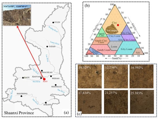 The study area is located in the Bailu highland in Xi’an, Shaanxi Province, with sampling coordinates at 34°14′55″ N, 109°05′47″ E (Figure 2a). Shaanxi Province is one of the regions with the widest distribution of loess in China, and the Bailu highland is situated about 15 km southeast of Xi’an, Shaanxi Province. It is a representative loess mesa with an elevation ranging from 690 m to 780 m []. In our laboratory tests, we examined the properties of the soil, with the results shown in Table 1. According to the Soil Classification Guide [] and FAO soil classification [], the collected soil texture is classified as Clay, and the soil type is classified as Calcisols. The soil contains the organic carbon (OC) content of 9.3 g·kg−1, nitrogen (N) content of 1.7 g·kg−1, and a phosphorus content of 0.6 g·kg−1. This indicates a relatively high organic matter content in the soil.