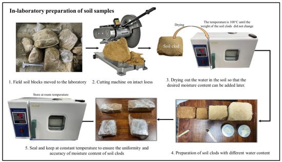 In contrast to the use of remolded loess in other studies [,,], we focused on studying undisturbed loess in its original state. To collect images of undisturbed loess, all soil samples were collected as intact blocks in field, which were then cut with a cutter to the desired dimensions in a laboratory. It is important to note that the minimum size for cutting is set at a width of 48 mm, height of 72 mm, and thickness of 20 mm. The determination of width and height ensures that the soil sample dimensions are larger than the imaging size of the camera, while the thickness consideration primarily focuses on the uniformity of moisture infiltration. As shown in Figure 3, the cut soil samples are then dried in an oven at 108 °C for more than 48 h, during which time they were weighed until there is no change in their weight; this is to ensure the accuracy of the different moisture contents configured in the experiment. These cut soil samples after drying are uniformly moistened with varying amounts of water. After moistening, the soil samples are sealed with plastic wrap and placed in a constant temperature chamber for 72 h to facilitate further even water penetration.
