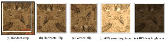 A total of 530 original RGB images were captured across 19 categories (10.929%, 11.276%, 12.178%, 12.236%, 14.061%, 14.787%, 15.919%, 15.984%, 16.592%, 17.186%, 17.634%, 19.844%, 21.257%, 22.400%, 22.558%, 22.685%, 24.395%, 25.049%, and 25.385%), with a resolution of 3072 × 2048 pixels. After cropping, a total of 3175 cropped RGB images were collected, with a resolution of 256 × 256 pixels. The image format used was Bitmap (BMP), which is an uncompressed file. BMP avoids the loss of information and distortion that may be caused by other lossy compression formats. For dataset partitioning, 70% of the images were randomly selected for training the SWC recognition model, while the remaining 30% were used for testing the model. Within the training data, 20% was further randomly chosen as a validation dataset to assess the convergence of the model. To prevent overfitting [] and enhance the robustness of the model, various data augmentation techniques were employed, including random crop, horizontal flip, vertical flip, 40% increase in brightness, and 40% decrease in brightness, as shown in Figure 5a–e. Additionally, data normalization was performed to improve the predictive accuracy and model fitting speed. Each feature variable was treated using normalization methods, which can boost the model’s performance. The normalization formula used for data normalization was as follows in Equation (1):
