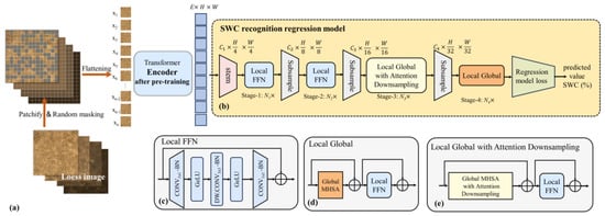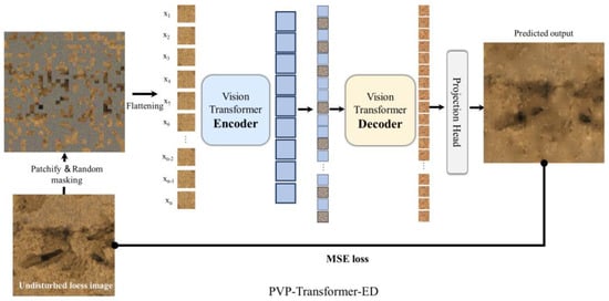 The loess images primarily consist of soil regions and non-soil regions (porous areas, mineral composition zones), which are highly similar and recurrent. Inspired with previous studies that used only limited statistical variables to characterize the whole image [,,,], we propose an initial hypothesis that a small amount of pixel information can be utilized to substitute the entire image as the input for SWC recognition models. This hypothesis will significantly reduce the reliance on computational resources and lowers the barrier to application. Hence, a pre-trained encoder–decoder architecture (PVP-Transformer-ED) was designed to perform an image restoration task, as illustrated in Figure 6.