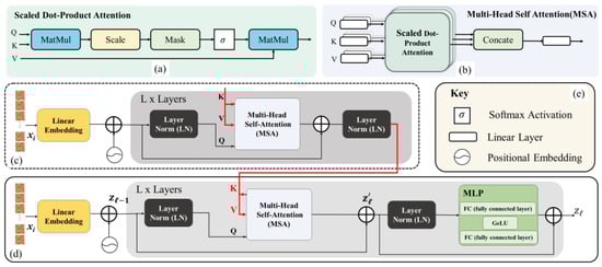 Transformer architecture in encoder and decoder. (a) Scaled Dot–Product Attention in Multi-Head Self Attention (MSA), (b) MSA, (c,d) are the overall architecture in transformer architecture, (e) The key of this figure.