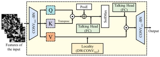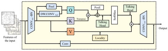 The attention mechanism, such as Multi-Head Self-Attention (MHSA) [], is beneficial for enhancing the model’s performance. As depicted in Figure 9, for the current input features, they are transformed into three distinct implicit spaces (Q, K, V) representing three different views of the same feature, where Queries (Q), Keys (K), and Values (V) are obtained by projecting input features using linear transformations. We first inject local information into the value matrix (V) by adding a DW.CONV with a kernel size of 3 × 3. Subsequently, we facilitate communication between attention heads by incorporating the fully connected layer over the head dimensions []. The process of the Global MHSA block is as Equation (11).