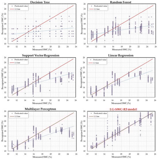 In conclusion, we found that different choices of traditional model had a significant effect on the recognition performance of SWC, which is similar to the results of previous research [,], but overall, they were significant and challenging to meet application requirements. In contrast, the LG-SWC-R3 model exhibited the best stability and satisfactory accuracy (R2 = 0.950, RMSE = 1.351%, MAPE = 0.081, MAE = 1.369%, which is lower than the maximum parallel error limit of 2% specified in []). To further analyze the recognition performance of the different models, we visualize their recognition scatterplots in Section 3.2.