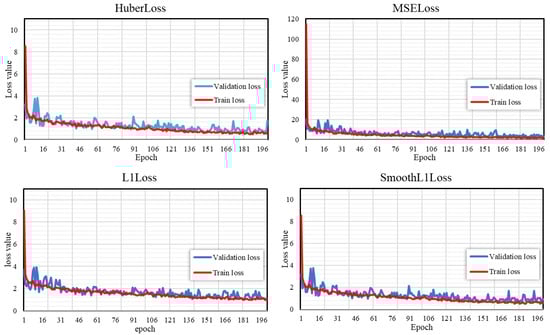 Surprisingly, as shown in Table 3, the choice of SmoothL1 loss and Huber loss seems to have little impact on the model’s performance, both in terms of prediction accuracy and outlier handling capabilities, while L1 Loss exhibits the best performance. This may be attributed to the fact that MSE loss penalizes large errors more significantly due to squaring []. L1 loss is less sensitive to outliers compared to MSE loss. SmoothL1 loss and Huber loss [] both combine elements of both MSE and L1 loss, behaving like L1 loss for small errors and like MSE loss for large errors. In the context of soil images, aberrant image information can influence model training, and L1 loss is better equipped to handle such scenarios. Therefore, for the subsequent experiments, we selected it as the loss function for the LG-SWC-R3 model. Furthermore, as illustrated in Figure 12, we also observed that models trained with these loss functions demonstrated similar convergence performance on the validation set, without signs of overfitting []. This indicates that the LG-SWC-R3 model is able to learn critical patterns in the data within an appropriate timeframe without excessively fitting the training samples.
