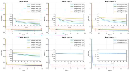 We conducted a thorough analysis on the impact of different hyperparameters (patch size and mask ratio) on the convergence behavior of the PVP-Transformer-ED. As illustrated in Figure 13, we observed that adjusting these hyperparameters did not significantly affect the convergence iterations of the PVP-Transformer-ED on the validation set, as it converged within 100 epochs regardless of the parameter settings. This suggests that the PVP-Transformer-ED can converge rapidly and effectively under various parameter configurations, exhibiting commendable optimization performance and stability. However, echoing the argument put forth in [,] regarding the significant challenge posed by larger patch sizes and mask ratios on reduction capabilities, upon a more detailed analysis of convergence behavior, we noticed that with the same mask ratio, as the patch size increased, the similarity between the reconstructed image and the original diminished, resulting in the loss stabilizing at a higher level. Likewise, maintaining a constant patch size while increasing the mask ratio also led to a decrease in the similarity between the predicted image and the original.
