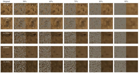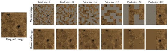 In Figure 15, images with various patch sizes are displayed to showcase the restoration effects under a fixed mask ratio of 0.5. It is evident that smaller patch sizes result in the better restoration of details, thereby indicating weaker generalization ability [] in the learned representation. Restoration tasks on smaller-scale patch blocks may be more easily accomplished by neighboring pixels or textures. Larger patch sizes cover a significant portion of image details; for example, with patch sizes of 16 and 32, where the masked patches do not fully cover complex and intersecting non-soil regions (such as pores, cracks, and mineral composition information). In such cases, the PVP-Transformer-ED relies on limited non-soil regions for restoration, leading to creative predictive structures where non-soil regions are treated as generalizable information in terms of size and depth. However, as the patch size continues to increase, the predicted masked patches exhibit poorer detail representation, with texture information gradually replaced by overly smooth color blocks. This phenomenon becomes more pronounced with a patch size of 112.
