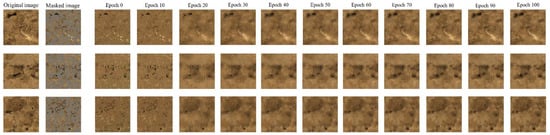 In this experiment (Figure 16), we take the example of a patch size of 8 and a ratio of 65%. We visualize the restoration effects of the PVP-Transformer-ED during the training process and document the corresponding results. We observe that the architecture’s reconstruction effect becomes progressively clearer with the increasing epochs. Edges and details gradually recover, and the image quality significantly improves. This result indicates that the PVP-Transformer-ED is learning better reconstruction representations. Additionally, the PVP-Transformer-ED successfully predicts key details in the original image (such as pores, cracks, mineral compositions, and other structures), avoiding excessive smoothing in patch prediction. This suggests that representations learned from visible patches can better capture the characteristics of the original image and preserve important detailed information during the prediction process.