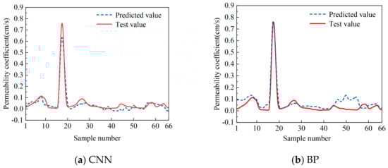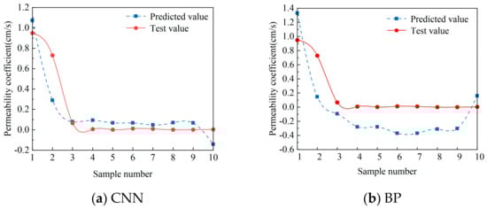 As can be seen in Figure 4, the predicted values of the CNN model are closer to the test values than those of the BP model, with less fluctuation in the curve and a more stable trend, indicating that the CNN model has higher prediction accuracy and better model performance. In addition, the CNN model has a better prediction effect when the test value of the sample permeability coefficient is about 0.1 cm/s or less, but the prediction accuracy is lower when the permeability coefficient is larger. The main reason for this is the small number of datasets (76 groups). The permeability coefficients of the dataset samples are concentrated around the order of 1 × 10−2 cm/s. The number of samples above 0.1 cm/s is small, providing insufficient data for the CNN model. Even on the dataset with only 76 sets of samples, the CNN model has good results, showing the powerful learning and fitting ability of the CNN, which also performs well in regression problems.