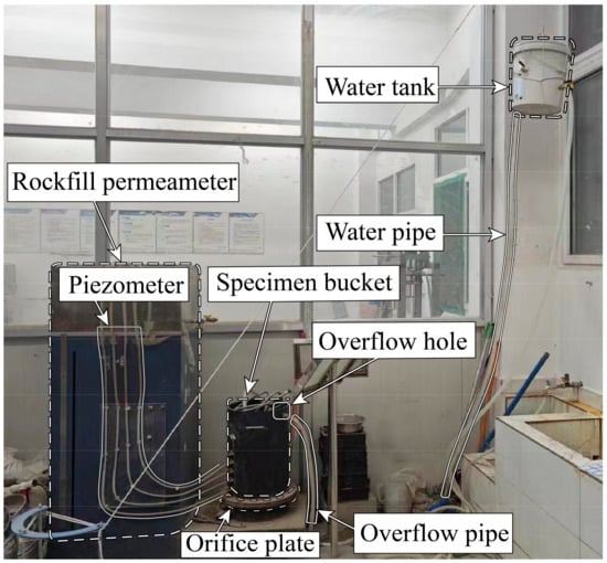 The permeameter sample gradation adopted the reduced scale of the field gradation of the rockfill dam. The samples were formulated to ensure good gradation, which is controlled by the coefficient of uniformity and the coefficient of curvature. Furthermore, the large particles greater than 60 mm in size were excluded, and the particle-size range was 2–60 mm. The rockfill permeameter was used in the test as shown in Figure 5. The diameter of the specimen bucket was 300 mm. The test was conducted with a water temperature of 20 °C as the standard temperature, and the permeability coefficient was measured at this standard temperature.