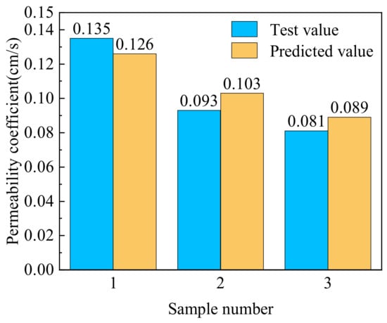 The comparison of the test values and the predicted values is shown in Table 7 and Figure 6. The complexity of the infiltration path of the rockfill material is related to many factors, such as the compactness, gradation, pore ratio, coefficient of uniformity, etc. Therefore, some error exists between the predicted permeability coefficient obtained with the CNN model and the test values. From Table 7 and Figure 6, it can be seen that the difference between the predicted values of the CNN model and the test values of the permeability test is not large and that the relative error is small, which meets the general needs of rough estimation in engineering. Therefore, the CNN model is applicable when evaluate the permeability coefficient of rockfill material.