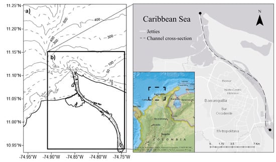 Fluvial estuaries, due to their location, have historically functioned as seaports and hubs for international trade. However, certain estuaries experience an increase in siltation rate that necessitates dredging channels to ensure and maintain ship navigability [,,]. The Barranquilla seaport, located within the estuary of the Magdalena River (MRE), holds a vital role in the economic development of the city and its neighboring regions. This is mainly due to its distinction of having the largest number of terminals for international trade in Colombia [,]. Nonetheless, the seaport’s operability encounters challenge due to the difference between the maximum bed sedimentation rates (2625 mm/year) and the maximum erosion rates (1450 mm/year), which is almost a twofold magnitude difference []. Hence, in order to maintain a minimum draught of 10 m, dredging operations are required []. The dredging procedure incurs high operational and logistical costs and does not offer a long-term solution. Moreover, it is conducted in disagreement with natural sedimentation patterns, rendering it an unsustainable approach [,].