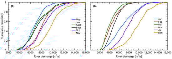 During the transition from the wet to the dry season, the variability in flow reaches its peak in January and maintains a high level (Qmax/Qmin = 5.91) until February (refer to Table 3). This phenomenon is primarily due to the absence of rainfall between February and March at the river’s estuary, coinciding with the Magdalena River basin’s flushing and the ITCZ positioning. It is evident that during these months, the probability distribution curve can be segmented into two distinct phases (see Figure 3B). An initial period of low slope and greater variability with flows between 4000 and 10,000 m3/s achieved 50% of the time, followed by another high-slope phase with discharges between 1500 and 4000 m3/s. This pattern confirms that the influence of the rainfall regime does not occur simultaneously.