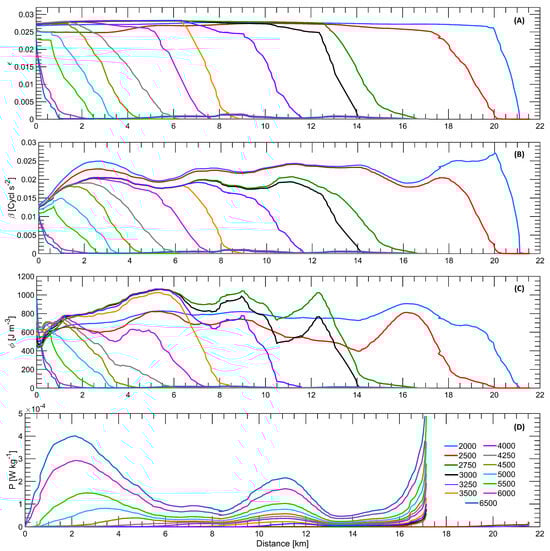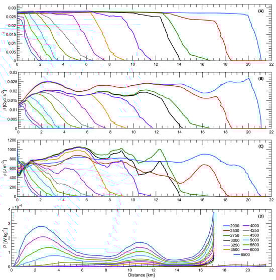 The FSI is between kilometers 1 and 6.5. Regarding the parameters, it is observed that at Q = 4250 m3/s, the maximum value of bottom turbulence is 4.30 × 10−5 W/Kg at km 11. At Q = 4500 m3/s, the maximum turbulence (Pmax) is 5.29 × 10−5 W/Kg and is also achieved at kilometer 11. At Q = 5000 m3/s, the turbulent production starts at km 1.2 and equals two peaks: Pmax = 7.706 × 10−5 W/Kg (3.6 km) and Pmax = 7.68 × 10−5 W/Kg (11 km). At Q = 5500 m3/s, β and φ suggest a decrease in stratification toward the Caribbean Sea during quadrature when comparing the maximum values in this phase (β = 0.0128 s−2) (φ = 636.18 J/m3) with the maximum values achieved during syzygy (β = 0.0151 s−2) (φ = 754.55 J/m3). For this flow rate, two peaks of turbulent production are reached: Pmax = 1.336 × 10−4 W/Kg (3.09 km) and Pmax = 1.05 × 10−4 W/Kg (11 km). At Q = 6000 m3/s, the stratification index decreases from 0.02 (immediately at the estuary) to 2.65 × 10−3 in the first kilometer and in the quadrature phase. In syzygy, this decrease begins 560 m later. Indeed, between 0 and 560 m, ϵ approaches 0.0245. A similar trend is seen for β and φ at km 1, β = 0.0062 s−2 (syzygy) and β = 0.00145 s−2 (quadrature), which ensures that at this distance, the tidal action has a stronger influence on the degree of stratification. In this scenario, mixing initiates at km 0 during quadrature, and km 0.25 in syzygy, which corresponds to two peaks of turbulent production. At Q = 6500 m3/s, the magnitude of turbulent production is even higher and starts from km zero with two peaks: Pmax = 2.08 × 10−4 W/Kg (2.68 km) and Pmax = 1.32 × 10−4 W/Kg (11 km), and Pmax = 2.80 × 10−4 W/Kg (2.52 km) and Pmax = 1.68 × 10−4 W/Kg (11 km).