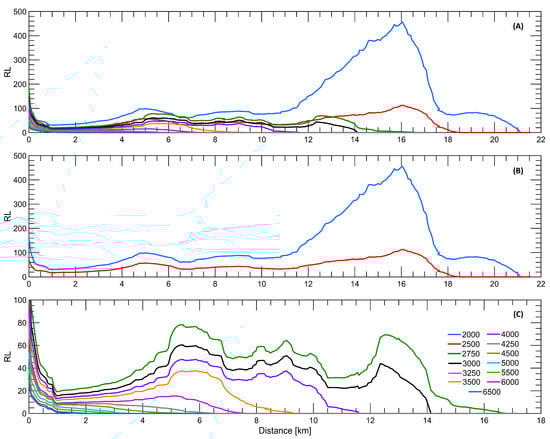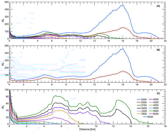 Richardson by layers (RL) at quadrature tide in: (A) all flow scenarios; (B) only the flow rates between 2000 and 2500 m3/s; (C) the flow rates ranging from 2750 to 6500 m3/s.