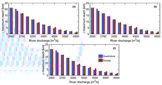 The farthest extent reached by the parameters of stratification, buoyancy, and potential energy anomaly is interpreted as the upper limit of the influence zone of the saline wedge from three different perspectives. The first perspective simply relies on the calculation of the density gradient [,]. The second perspective explores the vertical stability between two layers of water with differing physical properties. The higher the buoyancy index, the greater the stability. Peak buoyancy values commonly occur within the pycnocline [,]. Lastly, the potential energy anomaly measures the mechanical energy needed to instantaneously homogenize a water column []. A comparative assessment of the maximum reach of the wedge under syzygy and quadrature tide conditions reveals the important influence of tides on the extent of saltwater ingress (Figure 8). The stratification index indicates that during syzygy, there is a 1.5% increase in the depth of intrusion compared to quadrature. Likewise, the buoyancy frequency exhibits a parallel trend with a 1.42% increase. The potential energy anomaly reports a slightly higher total penetration of 2.6%. Nevertheless, this estimation may be imprecise when comparing stratification strengths at the same point during different tidal phases, particularly when the ratio of tidal amplitude to the thickness of the water column is not sufficiently small []. Within the Q = 2000 to 2500 m3/s range, the uppermost reach demonstrates a distinct pattern attributed to the widening of the channel geometry spanning kilometers 12 to 18. Despite this, all parameters consistently show an inversely proportional relationship between seawater infiltration and river discharge.