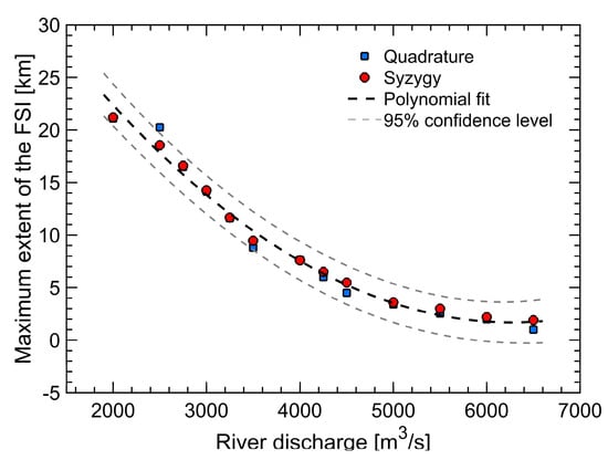 Based on the stratification and buoyancy parameters, it can be reaffirmed that the magnitude of flow rate and the FSI front displays a non-linear, inversely proportional relationship (as illustrated in Figure 9) described by the curve fitting formula FSI (Q) = 1.133 × 10−6 Q2 − 0.0142 Q + 46.2825. The given regression model has a coefficient of determination (R2) of 0.9846, thereby reaffirming the river dominance in the MRE dynamics [,]. This model stands as a promising inaugural approximation for predicting the location of the FSI and, in extension, for delineating regions where the TMZ may consolidate []. Formerly, ref. [] undertook this endeavor within the Pearl River estuary. This is a microtidal-fluvial estuary distinguished by its shallow depth and funnel-shaped geometry. They applied two regression methodologies, yielding results in alignment with our own findings. There is a non-linear, inversely proportional bond between the salt intrusion length and the river’s hydrodynamics. Furthermore, estuarine salinity exhibits variability not only due to the primary influence of the river but also in connection with the temporal alignment of peak flow events relative to the baseline flow conditions. These patterns have been observed in numerous estuaries worldwide, primarily through the application of Van der Burgh’s coefficients [,,].