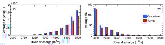 In this flow range, the FSI lies between km 14.3 and 21 of the section. There are distinct stratification levels between km 0 and 12, which are longitudinally maintained (ϵ ~ 0.026 and β ~ 0.019 s−2). Upstream, the gradual increase in mixing in the water column causes all parameters to decrease to their minimum values. At Q = 2000 m3/s, this happens from kilometer 20, while at Q = 3000 m3/s, it occurs from kilometer 12. For Q = 2500 m3/s, the location depends on the tidal stage: it happens at kilometer 17 during syzygy and at kilometer 17.5 during quadrature. The turbulent energy production at the riverbed is negligible (P ~ 0 W/Kg), resulting in underdeveloped mixing along the DDRM. In other words, greater levels of frictional strain are required to disrupt the stratification. This is confirmed by the Richardson number behavior (RL > 20), which results in a stable column (stratified) due to the dominant buoyant force on the turbulent bottom currents. At flow rates of Q = 2000 and 2500 m3/s, the stability greatly increases (RL ≫ 20) within the range of approximately km ~11.5 to ~17.5 due to the channel’s lateral widening. For a flow rate of Q = 2750 and 3000 m3/s, the potential energy anomaly φ concentrates energy in three locations where the maximum work required for water mixing is at approximately ~5.5, ~9, and ~12.5 km. This is followed by two valleys at approximately ~7.5 and ~10.5 km. All locations have values of φ > 470 J/m3, which reaffirms the intense degree of stratification.