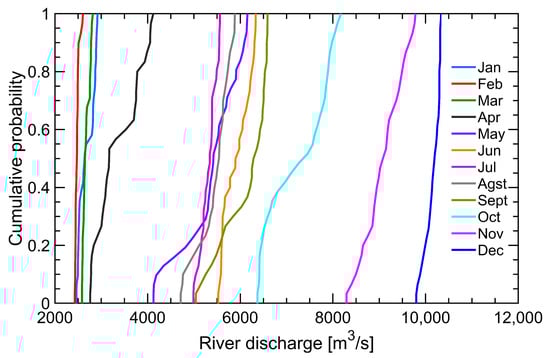 Acknowledging the pivotal role of the river outflow in the spatial position of the salt wedge [,], it is imperative to comprehend the seasonal probability distribution of this factor. Such comprehension will establish a connection between the numerical modeling results and flow rate regimes. Based on daily field measurements from a limnimetric station located in the municipality of Calamar [], the MR exhibits a strong monthly variability (see Table 3). Therefore, to assess its seasonal behavior, it was necessary to calculate the empirical cumulative distribution function (ECDF) []. This approach offers insights into the frequency and probability associated with each discharge magnitude.