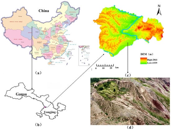 The study area was located in Heifangtai, Yongjing County, Gansu Province, on the western edge of the Loess Plateau in Longxi (longitude 102°53′ to 103°39′, latitude 35°47′ to 36°12′), with an elevation ranging from 1539 m to 2841 m (Figure 1). The average multi-year rainfall in the area is 287.6 mm, evaporation is 1593.4 mm, and the average annual temperature is 9.9 °C, belonging to the semi-arid climate of the mesothermal zone. Heifangtai is located in the fourth basement terrace on the north bank of the Yellow River, and the stratigraphic structure is, from bottom to top, purple-red sandy mudstone of the Cretaceous Hekou Group, pebble layer and orange-red powdery clay of the Middle Pleistocene of the Quaternary system, and loess of the Upper Pleistocene system [], with loess predominant in the surface layer. The physical indices of the soil [] are shown in Table 1. The study area is sparsely vegetated, and the top layer of loess is subject to more severe hydraulic and gravity erosion.