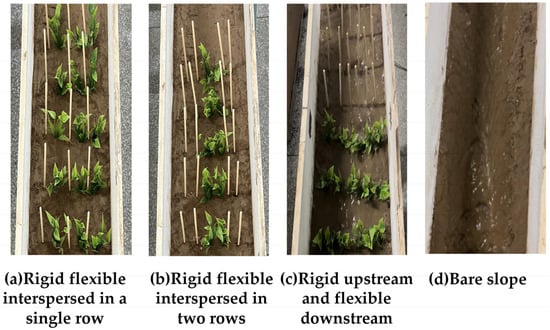 Rigid and flexible vegetation was selected for testing. Round wooden sticks with a diameter of 6 mm were used to simulate the rigid plants (e.g., buckthorn, willow) in the study area in the natural state, with a vegetation height of 13.8 cm under the inundation condition, and plastic simulated grass was used to simulate the natural flexible grass vegetation (e.g., ice plant, timothy grass, alfalfa), with an average height of 5 cm under the inundation condition. The density of this test was designed to be 60 plants, and the combination of vegetation was set in four combinations: upstream rigid–downstream flexible, rigid–flexible single-row staggered, rigid–flexible double-row staggered, and bare slope (Figure 3).